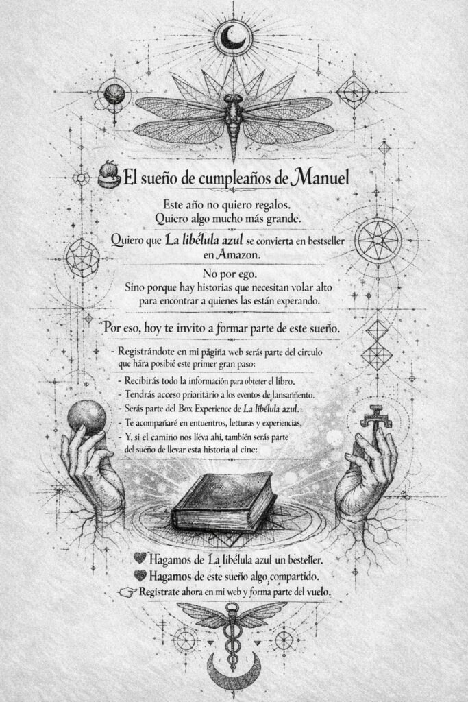 La libélula azul está inspirado en hechos reales y se apoya en estudios profundos de espiritualidad, simbolismo, ocultismo y sanación interior. La obra aborda temas como las heridas emocionales, la identidad y la transformación personal, proponiendo que el dolor y la sombra no son fallas, sino portales de evolución. A través de su propia historia, Manuel convierte sus vivencias en un relato simbólico en el que cada lector puede verse reflejado.